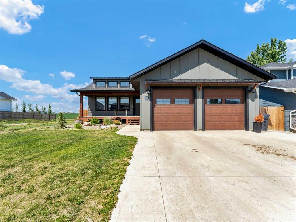 Step into contemporary comfort with this beautifully designed 2021 built bungalow, perfectly situated in the family friendly community of Westview Crescent, Bow Island. With its crisp curb appeal, welcoming front deck and striking vaulted ceiling inside, this home blends style and function for easy family living. The main floor features two spacious bedrooms, a full four-piece bath and convenient main floor laundry. The open-concept kitchen is a showstopper, complete with quartz countertops, a large island and modern cabinetry, ideal for both everyday meals and entertaining. The living room is anchored by a stunning fireplace and flooded with natural light from oversized windows and dormers. Downstairs, you'll find three additional bedrooms, another full bathroom and a large family room space, perfect for moving nights, play areas or a home gym. Outside, enjoy summer evenings on the expansive back deck overlooking peaceful prairie views, or sip your morning coffee on the front porch. The yard is easy to maintain thanks to underground sprinklers and the double attached garage offers ample parking and storage. Whether you're upsizing, downsizing or relocating this home checks all the boxes for quality, comfort and location. Book your showing today.