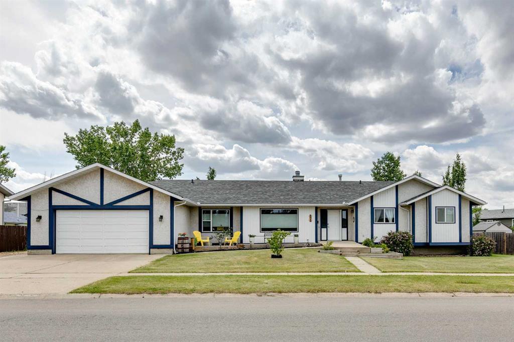 MASSIVE DOUBLE LOT! This beautifully renovated bungalow blends modern elegance with classic charm. Step inside to vaulted ceilings and expansive windows that fill the open layout with natural light, highlighting the seamless hardwood floors throughout. The upgraded kitchen is a chef’s dream with shaker-style cabinetry, white appliances, mosaic backsplash, a deep undermount sink, and built-in wine rack. The breakfast nook overlooks the backyard, while the cozy family room features a brick-faced wood-burning fireplace and French doors that lead to a private deck and outdoor oasis. The primary suite is a true retreat with deck access, vaulted ceilings, a walk-in closet with custom built-ins, and a spa-inspired 5-piece ensuite featuring a freestanding tub, rain shower, and his-and-her vessel sinks. Three additional bedrooms and a stylish 4-piece bathroom complete the main floor, along with a spacious laundry room equipped with high-end Samsung appliances. The fully finished basement offers two more bedrooms, a 4-piece bath, a large rec room with kitchenette, a gym area, cold room, infrared sauna, and generous storage space. Outside, enjoy a full-width deck, hot tub, manicured backyard with raspberry bushes and spruce trees, and a heated Quonset for hobbies or storage. The tandem triple-car garage and RV parking complete this dream setup. All this just 20 minutes to Airdrie and 40 minutes to Calgary. This is small-town living with big lifestyle appeal—don't miss your chance to call it home!