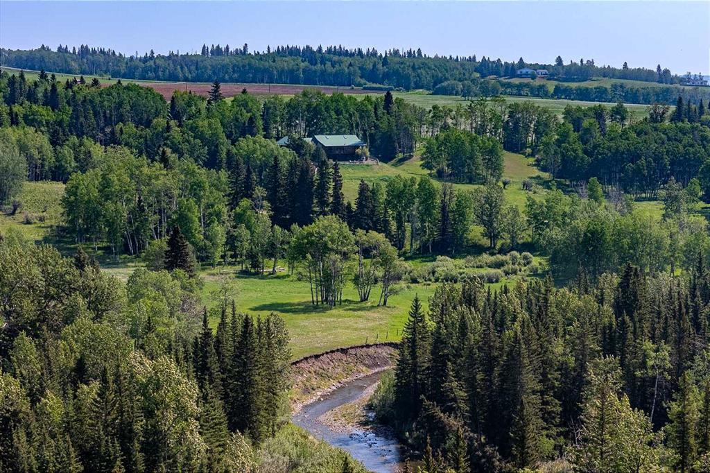 Welcome to one of Southern Alberta’s most extraordinary multi-generational property —83 acres of rolling hills, lush forest, open pasture + hay & accented with private river access on both sides of the river. Backing onto Kananaskis Country with jaw-dropping views of the Rocky Mountains, John Ware Ridge & the expansive valley below, this custom handcrafted log bungalow is a rare combination of natural beauty, rustic luxury, and complete seclusion. Winding past a scenic pond, next to forest & pasture with treated rail and barbed wire fencing, this private retreat opens to a beautiful log home - no detail has been overlooked. The main floor is stunning—open concept with vaulted 17-foot ceilings, expansive windows, and a full-length covered back deck designed to frame Alberta’s legendary big sky sunsets. The showpiece wood-burning fireplace stretches the length of the living space, creating a cozy focal point for games nights, family gatherings, or curling up with your fur babies. The massive kitchen, complete wt black leather finish granite countertops, flows seamlessly into an oversized dining space, ideal for entertaining. The home features an oversized double attached garage! The walkout lower level is bright & airy with great natural light and offers thoughtfully designed spaces. Renovated in 2015, both bedrooms feature custom built-in cabinetry and custom-built bed frames. A second bedroom with its own built-in features and a large full bathroom also located on this level, along with a dedicated home office. The primary bedroom is a tranquil & offers views of the mountains and rolling hills. With a fabulous walk-in closet & spa-like ensuite, complete with a built-in massage bed and his and hers sinks, you feel like being in heaven. In-floor heating throughout the basement ensures year-round comfort. Recent updates include new vinyl plank flooring (2021), new refrigerator (June 2025), updated interior and exterior lighting, freshly stained exterior logs, and a repainted deck (2025). The home also features a gas-supplied outdoor BBQ and a custom-built outdoor fireplace, perfect for enjoying peaceful evenings in nature. The full-width glass-paneled back deck offers multiple cozy corners to enjoy privacy, weather protection, and spectacular west-facing sunset views. The land itself is as impressive as the home with a mix of open grazing land and hay field at the top near the entrance, natural spruce tree growth, mature vegetation and forests, and a scenic rock pathway leading down over rolling land & the river. A newly built 24’ x 20’ three-sided tin shed (2023) adds functionality to the property. Option for two homes under MD of Foothills bylaws (over 80 acres), this estate offers future potential while ensuring complete privacy with no visible neighbors. Wildlife roams freely—moose, elk, deer, bears, fox, and turkeys—all add to the magic. Whether putting your toes in the river during the summer, fishing, or riding your horse, this land is one of a kind!