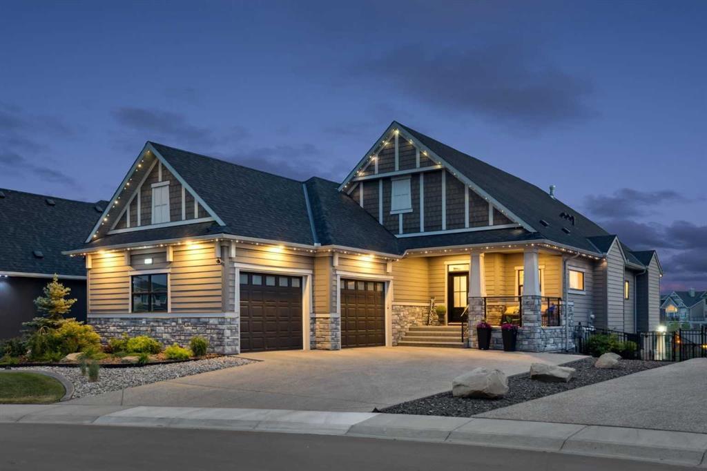 Incredible opportunity to own a rare property on Bayside Island. Situated on a peninsula surrounded by water, only 12 families have the privilege of calling this street home. Backing west, with extensive professional landscaping, you will be delighted with this impressive bungalow estate. The impeccable floor plan has been designed to be airy and bright with each room thoughtfully apportioned. The expansive vaulted ceiling, warm neutral tones and quality finishings elevate the serenity and flow in each space. The kitchen is the heart of the home with a large pantry, a separate butler pantry, a massive central island and rich cabinetry. The living room features a floor to ceiling tiled fireplace that adds grandeur. Off the ample dining space, are sliding doors that lead to a full width deck with a covered area for shade and stairs that lead to the yard below. The primary suite features stunning water views with a luxurious ensuite. A sumptuous soaker tub, a large tiled shower, dual sinks with storage and a walk-in closet with custom organizers will make you feel truly spoiled. Off the primary is two way access to the laundry room with custom cabinetry. A mud room, main floor den/office and two piece bath round out this level. The fully developed walkout basement was finished with a mind toward entertaining. In-floor heat makes it comfortable year-round. A large recreation area features space for movie nights on a big comfy couch, games nights around the table and a custom wet bar to keep everyone in high spirits! Two additional bedrooms, a home gym and a 4 piece bath complete the tour of the basement. Outside, the private dock is the perfect launch pad for paddleboarding or kayaking along the canal. Enjoy sunsets in the hot tub, and later, cozy up around a crackling fire under the pergola. This home is meant for making memories in a place that truly exceeds the imagination. The triple garage is heated with 11 ft ceilings, ample space for vehicles and storage. Additional updates include many modern conveniences including Gemstone Lights, Hardie board siding, a tankless hot water system, water softener, an induction stove (you'll never go back), air conditioning and an irrigation system in the front and back yard. This is a fantastic community with many walking trails. Check out the link on the listing to view the video tour.