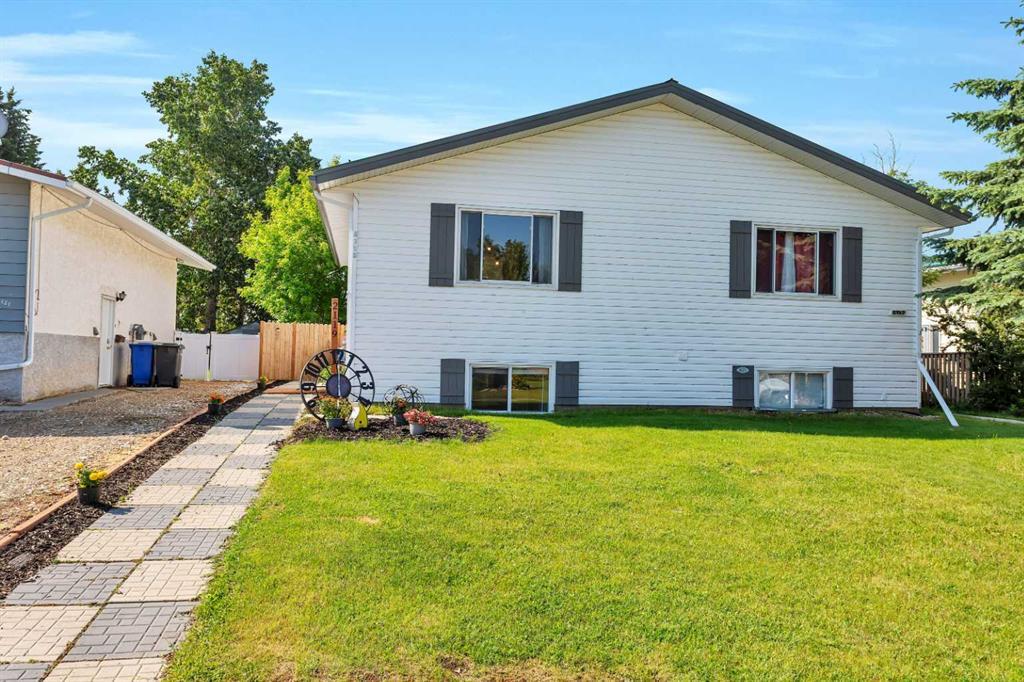 Looking for a super cute updated 1/2 duplex with single garage in a quiet town? You've found it in this nicely modernized perfectly sized home, with lots to offer! New paint throughout most of the home, with new light fixtures & trim and new flooring in the entryway. Kitchen cabinets have been freshly painted & the new subway tile backsplash adds a modern feel. The living room has laminate flooring, a large window & lots of room for big furniture. There is a funky 2 piece bathroom & main floor laundry! The kitchen is bright & open & offers lots of counter space & cabinets & a pantry as well. Dining area can accomodate a good sized table for family or entertaining. 3 bedrooms are in the basement - nice & cool in the summer - and the primary has a a fantastic walk-in closet. 2 additional bedrooms & a 4 piece bathroom finish off the lower level. The front yard has been recently landscaped and there are perennials growing on the east side. The back deck is south facing & overlooks a fenced yard with great storage shed & oversized single car garage. Super easy access to QEII, a short jaunt to Innisfail & Red Deer and conveniently located walking distance to school, library, parks & playground!