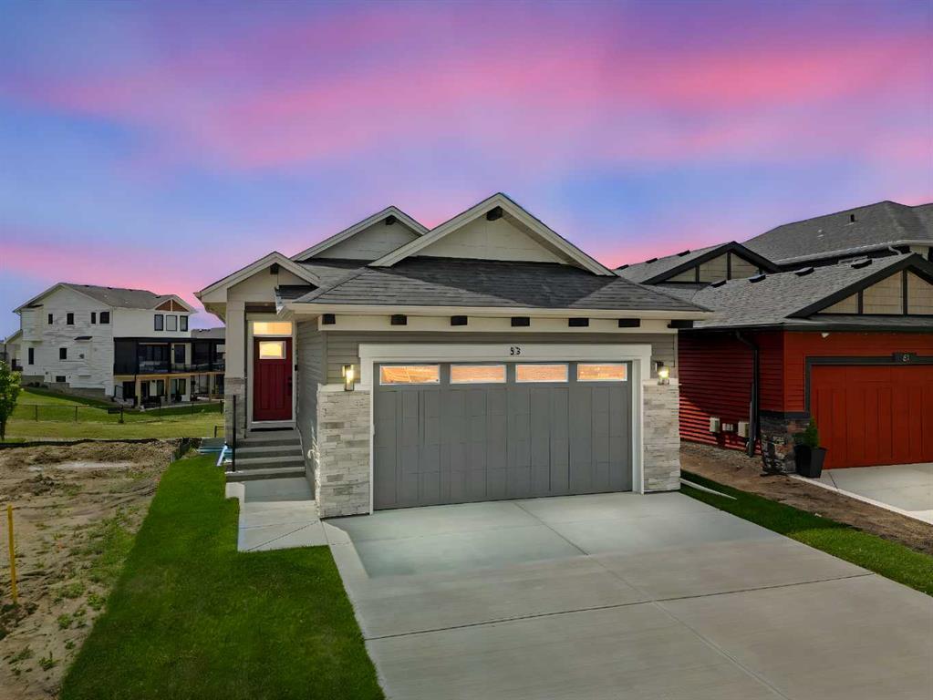 Imagine sitting on your covered deck - gazing at the majestic Rocky Mountains - watching birds fly over the pond, and listening to only the sounds of nature..... That is what life can be like when you live at 53 EMERSON CRESCENT! This executive WALKOUT bungalow has been remarkably kept by its owners. PRIDE OF OWNERSHIP shines through the entire property. Step inside the home to the welcoming bright and sunny front entrance. Luxury vinyl plank flooring leads you through this functional floorplan. The expansive vaulted ceilings bring space and natural light into the home. The convenient front office provides a second main level room for guests or that extra place to work from home. The upgraded kitchen features beautiful cabinetry, a large pantry , stunning quartz counters, induction stove, a large sit up island - perfect for the chef at heart. Entertain family and guests in the large open concepts spaces. The dining space has room for a large table and a nook to accommodate a future coffee bar or extra storage cabinet. The cozy living room looks out to the views that will capture your heart. Step into the primary retreat and be wowed by the natural light - the beautiful windows, a large walk in closet , and an ensuite you will never want to leave. Glistening glass and marble tile blended with stunning quartz, double sinks , and a large soaker tub, give the perfect place to relax and unwind after a long day. The lower level provides just as much natural light as the main. A large family room, a craft nook ( or space for wet bar) 2 more large bedrooms, loads of storage, and a 4 piece bathroom make this lower level the perfect floorplan to accommodate all of your needs. The upper level deck is nicely finished with duradeck , a custom aluminum pergola, a gas-line for BBQ's , and water line for washing and watering- what a nice touch. The concrete patio below offers a shady and dry place to watch wildlife, and enjoy the serenity of the pond and pathways. With so many features and upgrades - you truly have to see this house to appreciate the views, the features, and the actual space this home has to offer. With almost 2400 sq feet of living space, main level laundry, a large attached garage , and better than new condition, I promise you will not be disappointed!
