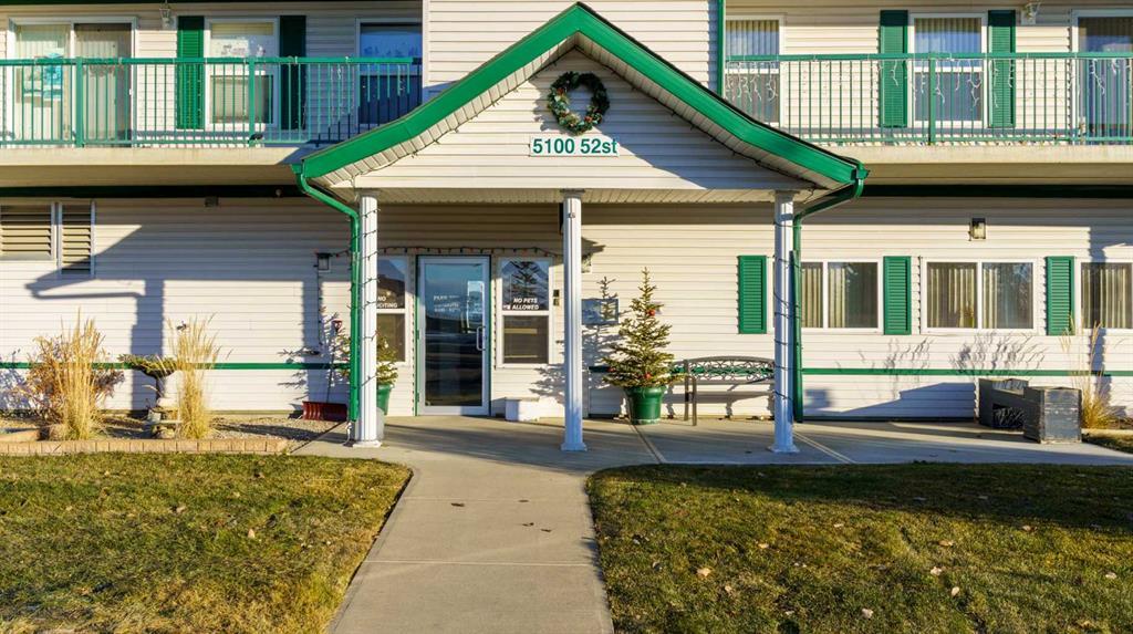 Bright corner 2-bedroom unit in Park Terrace, a 55+ Adult Building. Close to downtown Olds and within walking distance to the Public Library, Sportsplex/Curling Rink, Evergreen Center and Post Office. Enter the apartment to a spacious entry, the unit features a beautiful kitchen with peninsula, plenty of cabinetry and window over sink, large dining area with cathedral ceiling which has plenty of room for large table for those family gatherings, roomy living room and east facing balcony with storage. The master bedroom offers a 3-piece ensuite and a large closet area. There's an additional bedroom/office, a 4-piece bathroom, and laundry area with stackable washer/dryer only 1 year old. Vinyl plank flooring throughout the unit for easy upkeep. The unit includes a heated underground parking stall. Common areas feature a Games/Puzzle Room and a Breakfast/Lunch/Coffee Area. An outdoor fenced area is available for BBQs and relaxation. The building comprises 24 units, and the residents are very friendly, frequently gathering to socialize and enjoy each other's company. Condo fees include heat, water, Sewer, garbage.