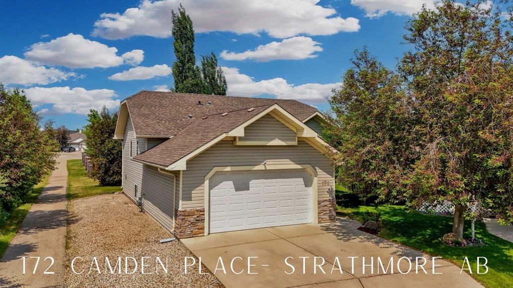 *** Check out the YouTube video for community and unit highlights *** ORIGINAL OWNERS | BACKS ONTO GREEN SPACE | BOAT/RV PARKING + OVERSIZED GARAGE | QUIET CUL-DE-SAC| Welcome home to 172 Camden Place, located in the family-friendly town of Strathmore and just a short 35-minute commute to downtown Calgary. This wonderful family home is on the market for the first time and features central A/C, vaulted ceilings, an oversized double attached garage PLUS RV/BOAT PARKING, and backs directly onto a green space/park area at the end of a quiet cul-de-sac, truly an unbeatable location. As you enter the main level, you’re greeted by an abundance of natural light flowing through large windows and expansive vaulted ceilings. The main level features a large living area with south-facing windows and vaulted ceilings, providing plenty of space for family and friends to relax. The spacious kitchen includes a large island with breakfast bar, sleek white appliances including a new dishwasher, ample cabinet space, a large pantry, and a sizable dining area surrounded by windows overlooking the yard. Additionally, you’ll find a large primary bedroom with walk-in closet and 3-piece ensuite, two additional well-sized bedrooms, and a second 3-piece bathroom, making it an ideal family layout. The fully developed basement offers a fourth bedroom along with a large home office space, perfect for those working from home or for a teenager needing their own area. There’s also a large rec room with a freestanding gas fireplace and a spacious laundry room with a brand-new dryer. The large 17x15 undeveloped area in the basement is presently used as a workshop and has plumbing roughed in for a shower, sink and toilet. The window meets Alberta egress requirements which creates the potential for a larger bedroom with ensuite. The backyard is where this home truly shines, backing directly onto a green space with a large deck offering extra outdoor room for the kids to play and a level of privacy not always found in newer areas. This home is within walking distance of Wheatland Elementary School and just a short distance to Strathmore High School, George Freeman K-9, as well as shopping, the Strathmore Aquatic Centre, Highway 1 access, plenty of parks and pathways, and even the local racetrack just 2 minutes away for the adrenaline junkies. This family home is available just in time to enjoy the rest of summer and be settled before the new school year begins. Book your private showing today!