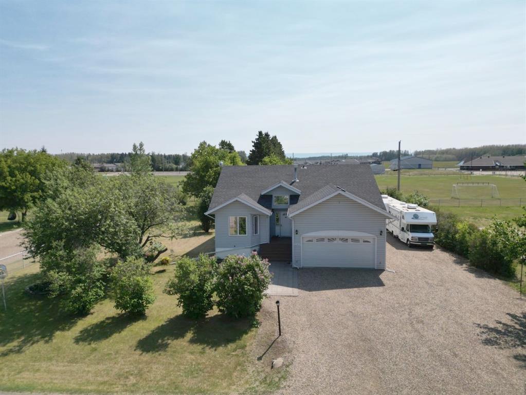 Location, Location, Location! This cozy 5-bedroom, 2.5-bath home with an attached heated garage is perfectly situated on a huge private lot backing onto the school yard—an ideal spot to raise a family or settle in for retirement. The exterior boasts tons of parking, including a gravel pad for your RV or trailer, a beautiful backyard oasis with a large deck and gazebo, a hot tub area, and a spacious side yard filled with mature trees and flowerbeds. Inside, the quality and attention to detail shine with vaulted ceilings, top-of-the-line finishes, and an inviting open-concept layout. The kitchen offers ample cabinetry and flows seamlessly into the dining and living room, where a gas fireplace adds warmth and charm. The main floor master suite is a true retreat, featuring a renovated ensuite, walk-in closet, and main floor laundry with garage access. The basement is cozy and functional with a wood-burning stove, two bedrooms, and a half bath—plus plenty of space to relax or play. A must-see property in a truly unbeatable location!