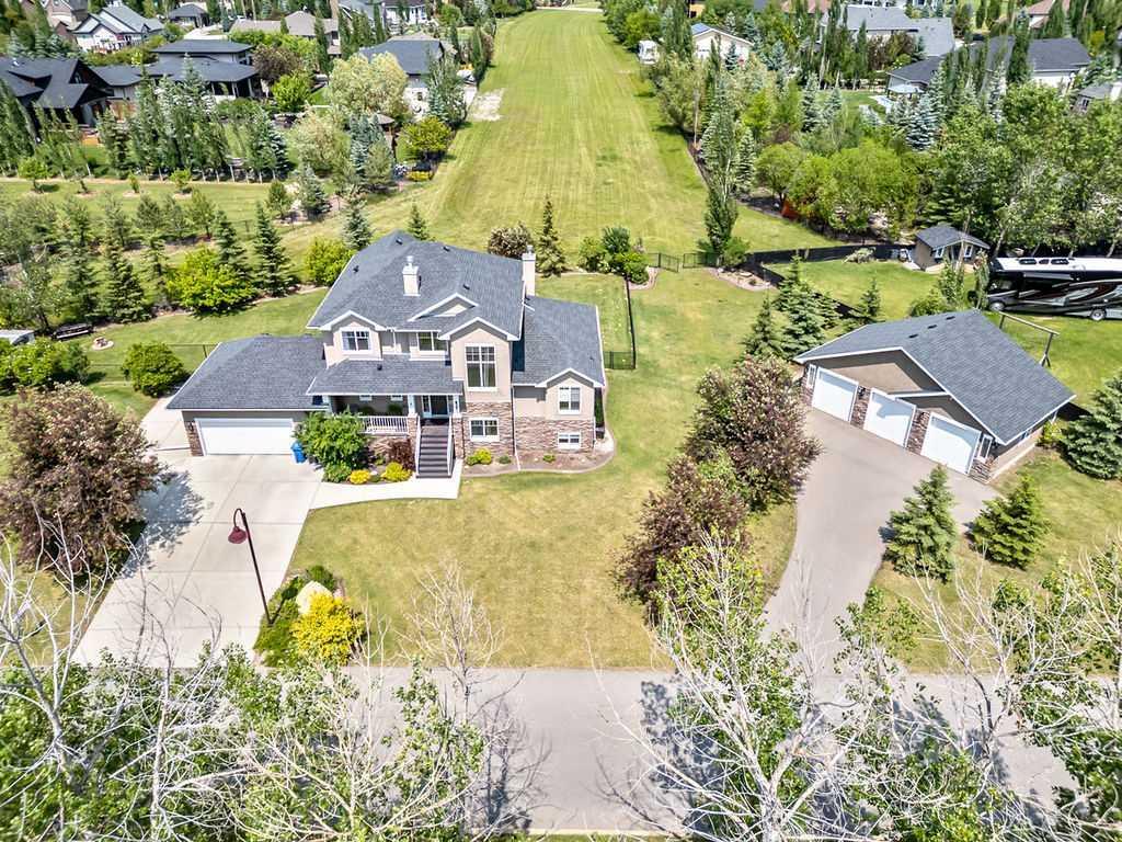 Experience the best of both worlds with this exceptional 5 bedroom two-storey home with over 3400 square ft of developed space situated on a beautifully landscaped .64-acre lot in the exclusive community of Okotoks Air Ranch. Inside, you’ll find a bright, open-concept Great Room featuring a cozy gas fireplace flanked by custom built-in cabinetry. The gourmet kitchen impresses with stylish white cabinetry, granite countertops, upscale stainless steel appliances including a gas stove, and a large island perfect for entertaining. A unique highlightof the home is the main floor primary suite large enough to accommodate your king-sized bed and complete with a spa-like ensuite and walk-in closet. Refinished hardwood flooring, fresh paint, and main floor laundry add to the home’s appeal and convenience. The central turned staircase leads to the upper level boasting a bonus room, two generously sized bedrooms, and a full bath—ideal for family or guests. The professionally finished basement offers a massive recreation/games room, two additional bedrooms, a full bath. Car lovers and hobbyists will love the oversized attached double garage plus an additional triple detached garage, providing space for all your vehicles and toys. Step outside to a meticulously manicured lawn and stunning landscaping—perfect for family gatherings, summer BBQs, or simply relaxing in your private oasis.