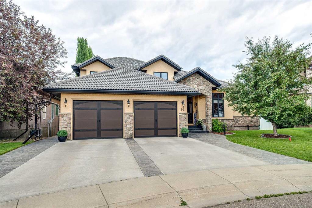 Welcome to this stunning, custom-built walkout bungalow nestled in one of Anders' most sought-after locations. Situated on a massive pie-shaped lot, this one-of-a-kind home offers exceptional craftsmanship, luxurious features, and expansive living space, perfectly tailored for families who value comfort and elegance. Step into an impressive open-concept design with soaring 11-foot ceilings, rich maple hardwood flooring, custom moldings, and beautifully crafted niches throughout. The gourmet kitchen is a chef’s dream, featuring high-end maple cabinetry, granite countertops, a full tiled backsplash, crown moldings, a walk-through pantry, and a large island with a second sink—ideal for hosting and everyday convenience. Adjacent to the kitchen, the elegant living room boasts a striking stone fireplace as its focal point. Also on the main level is a spacious office, a convenient 2-piece powder room, and a thoughtfully designed huge laundry/mudroom with ample storage, perfect for growing families. The private primary suite features a walk-in closet and a luxurious 4-piece en-suite, providing a peaceful retreat. The upper level is ideal for children or guests, featuring two generously sized bedrooms, each with its own walk-in closet and private bathroom! The expansive walkout basement is finished for both entertainment and relaxation. It includes a large rec area with a games area, a cozy family room, a bar, and a hidden wine cellar. A fourth bedroom and a full 3-piece bath are also in place. In-floor hot water heating and hardwired speakers add to the comfort and ambiance. Just out the door is a beautiful patio with a hot tub and a large yard Enjoy the west-facing backyard oasis with mature landscaping, a private stamped concrete patio, and a low-maintenance vinyl fence. There's even space to build your dream second garage. This extraordinary property combines upscale living with thoughtful design in one of Red Deer’s most desirable neighborhoods. Waiting is the perfect next home. See for yourself—you’ll be glad you did!