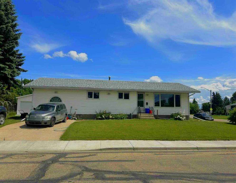 Large bungalow on a corner lot (no backyard to maintain) located on the South end of town across from the Hospital grounds. This home has had some updates over the years including NEW WINDOWS, NEWER ROOF, and NEWER SIDING. This home is perfect for a fixer upper, investor, someone looking for main floor living or to keep their mortgage low. The garage has been converted to a large primary suite but could possibly be converted back to a garage. There is another bedroom with a two piece ensuite and a third bedroom that was opened up for a bigger space. The living and dining room are nice and bright with large windows. Outside there is a side yard that could possibly be fenced off for more privacy, and having no backyard gives you less lawn to look after. There is a front driveway for parking.