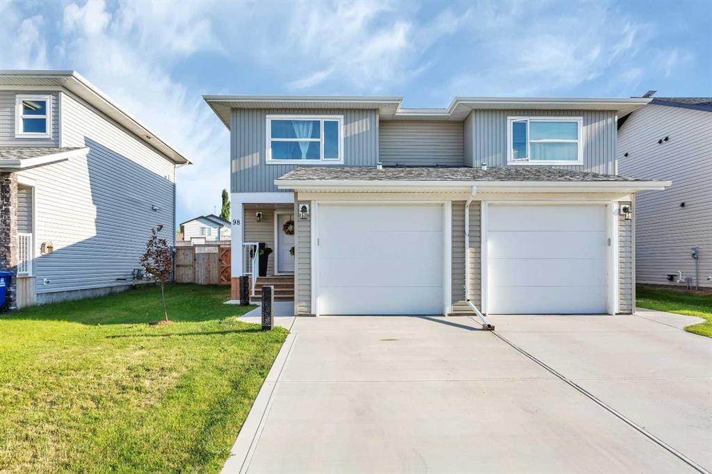 This well-maintained 3-bedroom, 2-bathroom semi-detached, two-storey home built in 2020 offers modern comfort and durability, with 5 years of Alberta new home warranty remaining. Pride of ownership is evident throughout, featuring an attached finished garage and a fully fenced, south-facing backyard that opens via the back gate to the Trans Canada Trail leading to Lacombe. The inviting covered front veranda welcomes you into a spacious foyer and an open-concept main floor with 9-foot ceilings, enhancing the sense of space. The functional kitchen boasts ample maple cabinetry with a built-in pantry and pots-and-pans drawers, a large island with an eating bar, tile backsplash, stainless steel appliances, and a window overlooking the backyard. An under-sink reverse osmosis water system adds convenience. The kitchen seamlessly connects to the dining area with sliding doors to a south-facing deck, perfect for outdoor entertainment. A convenient two-piece bathroom completes the main level. Upstairs, the primary bedroom comfortably fits a king-sized bed and includes a walk-in closet and a cheater door to a spacious five-piece bathroom with dual sinks. Two additional good-sized bedrooms and an upper-level laundry enhance everyday convenience. The unfinished basement has roughed-in plumbing for an additional bathroom, bedrooms, or a family room, offering versatile space for future customization. The finished attached garage provides extra parking, complemented by driveway space. The backyard features a manicured lawn, trees, and a back gate that opens to walking trails, making outdoor recreation easily accessible. Additional security is provided by a keypad lock on the front door. This property is ideally situated in Aspen Lakes Subdivision, near the Abbey Centre, only two blocks from the new Catholic school under construction, shopping, and provides convenient access to the QEII for easy commuting.