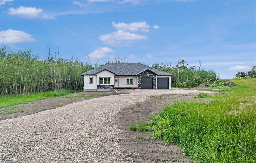 Looking to get away from the hustle and bustle of City living to a place with some privacy and space? But.. don’t want a long commute and dread the idea of driving gravel roads? Then you need to check out this beautiful new home by Destiny Homes and Developments in the Grandview Heights subdivision. Located just 10 minutes West of Grande Prairie with pavement right to the lot line this 1,657 sq.ft. bungalow home is situated on a gorgeous 5.03 acre rolling lot that features a mix of open grassed area and trees. The home has an open concept living area featuring an abundance of natural light through the numerous large windows, a great kitchen with a large island and an oversized pantry, as well as lots of room for a family sized table in the dining and great gatherings in the living room. There are 3 bedrooms on the main level with the primary suite featuring a walk-in closet and four-piece ensuite washroom. Rounding out the main level is a second full washroom and a mudroom off the garage entrance with closet, bench, and a laundry area. Downstairs the basement has good sized windows due to the sloping nature of the lot and has been framed to accommodate 2 bedrooms, a washroom, home theater area and a large rec room. The triple car attached garage has two overhead doors on the front for your everyday drivers and a side overhead door for your toys or tools. This home is tucked into the trees so you can sit on your rear deck and enjoy complete privacy from any neighboring property. This home is ready for immediate possession, so contact your favorite real estate professional today to have a look and start packing!