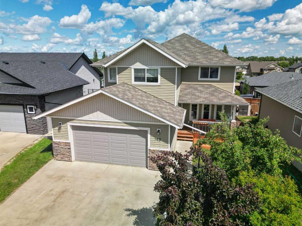 Fully Finished 2 Storey with Walkout Basement & Two Garages located on a quiet close in Blackfalds. From the covered front porch with swing, step into the bright & open main floor where you will find modern paint colors and plenty of windows providing an abundance of natural light. The kitchen / dining area boasts stainless appliances, full tile backsplash, large island with eating bar, and a corner pantry. From dining room is access to the upper deck with stairs down to the fully fenced & landscaped backyard. The main floor is complete with a living room & cozy gas fireplace, an office (or flex room), 2-pc bathroom, laundry room, and access to the front attached heated double garage.