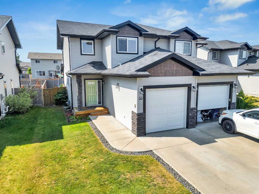 NO CONDO FEES!!! TOTALLY RENOVATED AND FINSIHED BASEMENT!! NEW Appliances!! First time homebuyers, investors or those looking for something totally REFRESHED and move-in ready! This half-duplex with attached single garage has been lovingly updated, and feels fresh and modern. The new finishes, flooring, fixtures, as well as the brand new developed basement makes this lovely home a show stopper. The main level includes a half bath, large entry, and a light and airy living room and kitchen. Up the newly carpeted stairs you will find a primary bedroom with walk-in closet (extra hookups for laundry) and a full ensuite as well as 2 more bedrooms and a full bath. The basement was just finished and includes a nice big bedroom option, family room and a beautiful 4 pc bathroom / laundry combination. You have storage under the stairs, in the garage AND outside in the cute barn shed. Fully fenced and a new structure over the deck has the backyard ready for summer BBQ’s! Located on a family friendly close and and easy walk to parks, skating rinks, and the bike park as well as quick access to the trail and bike/walking paths Blackfalds has to offer!