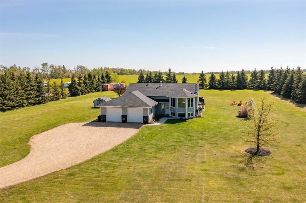 Visit REALTOR® Website for additional information. Discover the perfect blend of space, comfort, & convenience with this beautifully maintained 5-bed, 3-bath home with A/C, an oversized double attached garage, situated on 3 acres in a prime location. With paved access all the way up to the driveway this home is just 5 min to Sylvan Lake & 10 min to north Red Deer. Enjoy peaceful country living with nearby amenities. The main floor features a spacious living room with wood-burning fireplace, functional kitchen with dining area, large primary with walk-in closet & 4-pc ensuite, 2 more beds, a full bath, & laundry/mudroom. The finished basement includes a huge rec room, bar area, 2 additional beds, 4 pc bath & common area plus great storage. The private acreage gives you space to breathe, garden, build, or simply enjoy quiet country views while sitting around the firepit or on the patio.
