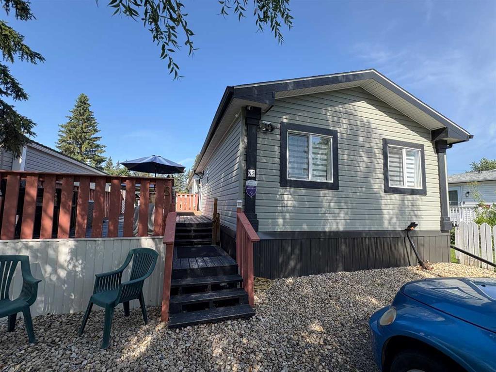 This beautifully maintained 3-bedroom, 2-bath modular home offers 1,520 square feet of bright, open-concept living space, thoughtfully designed for comfort and ease. Built on durable steel I-beams, the home features a vaulted ceiling with a skylight that fills the main living, dining, and kitchen areas with natural light. The list of recent upgrades is extensive and includes new flooring, fresh paint throughout, new blinds, modern light fixtures, stylish mouldings and baseboards, new door hardware, bathroom mirrors, towel racks, and toilets. The kitchen has also been enhanced with a new microwave, stove, and deep freezer, making it ready for everyday living and entertaining. Additional features include central air conditioning, a reverse osmosis water purification system, water softener, and a fully insulated metal skirting system with heated crawl space, sealed bladder, weeping tile, sump, and ventilation—ensuring warm, dry floors and near zero risk of frozen pipes. Outside, enjoy a brand new deck with a charming lattice gazebo, a freshly added doorstep, and a low-maintenance yard that's fenced for pets, with very little grass and a handy shed for storage. A new heat tape adds another layer of winter security. Located just off desirable 44th Street and steps to the lake, this property comes with a front driveway and is part of Spruceline Park—a quiet, professionally managed community by SunReal Property Management. Lot rent is a budget-friendly $540/month and includes water, sewer, and garbage removal. This turn-key home is an exceptional find in a well-kept, conveniently located neighborhood.