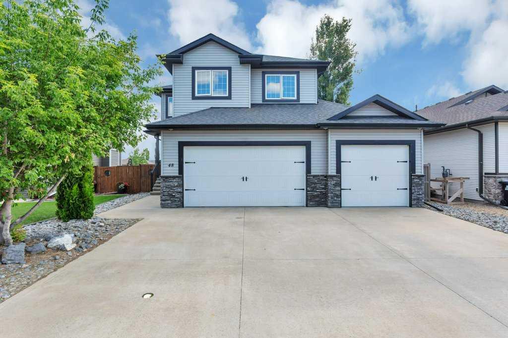 Welcome home! 48 Chinook Street offers a perfect blend of attached TRIPLE GARAGE with a rear overhead garage door leading to a concrete parking or hot tub pad, a great main floor layout with large windows providing ample natural light, open concept main floor and a well designed upper level with 3 large bedrooms and a separate flexible family room! The wide driveway and triple garage takes care of parking and storage, and upon entering you'll be welcomed by a large entrance and entry closet - room enough for the entire family to come home. The main level features a gas fireplace in the living room, and hardwood floors throughout, the rear dining room is surrounded by natural light, a beautiful space for family meals. The kitchen is ideal for gathering and meal prep, there is a large center island with eating bar and granite sink. There are quality 2 toned maple cabinets, stainless appliances and walk through pantry! The main level is completed with a 2pce bath and laundry! Upstairs you will find 3 large bedrooms including the spacious rear master with plenty of room for a king bed, it's got a walk-in closet and lovely 5pce ensuite with dual vanities and separate shower. There is also a upper family room and 4pce bath. The basement is framed and wired and offers plenty of future potential development space for a family room, bedroom and full bath! The sunny rear deck has been freshly stained and the spacious yard is fully fenced!!