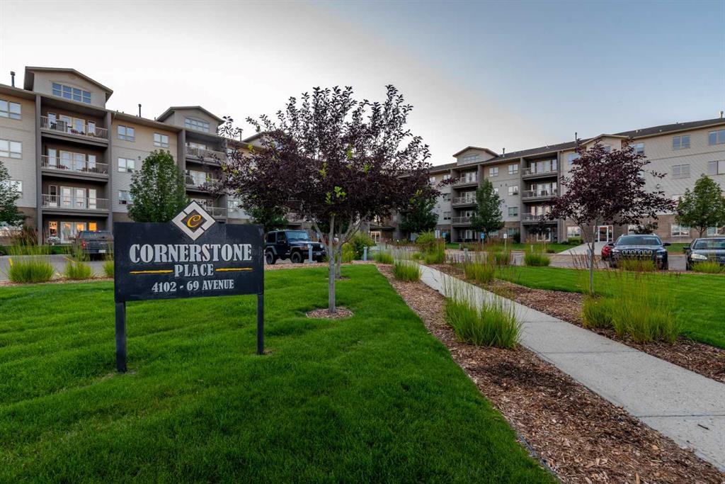 Welcome to Cornerstone Place! This bright and well-kept 2-bedroom, 2-bathroom main-floor condo is ideally located in a secure and professionally managed building. With over 1100 square feet of living space, this home offers a functional layout perfect for first-time buyers, investors, or those looking to downsize without compromise. Enjoy the convenience of an open-concept kitchen, dining, and living area, complete with ample cabinet space and a private patio just off the living room—ideal for morning coffee or evening relaxation. The primary bedroom includes a full ensuite and generous closet space, while the second bedroom and full guest bathroom offer added comfort and privacy for family or guests. Additional features include in-suite laundry, air conditioning, and two parking stalls—one underground heated stall for those cold Alberta winters and one surface stall for guests or a second vehicle. Located just steps from shopping, schools, and parks, this unit is a fantastic opportunity in a sought-after complex. Quick possession available! Check out the 3D virtual tour!