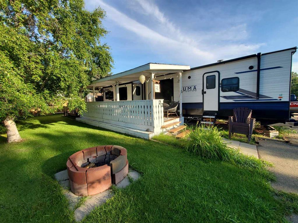 Considering a recreational property in Sylvan Lake? Points West RV Resort provides your best value in prime recreational real estate. Voted one of Canada's ten best beaches, Sylvan Lake is Alberta's primary tourist destination. #22 Points West is a 2,845 sq/ft titled lot with mature birch trees and a new fence. The included Puma Destination trailer with an Island Kitchen and opposing slides calls for lots of space for entertaining guests. In the rear of the camper, the dinette with a large window provides a great vista of the outdoors while doubling as a place to eat. The second bedroom houses a sofa bed and upper bunk providing a useful office space or granting guests a comfortable stay with the privacy of their own room. The sliding patio door gives the look and feel of being at home and walking out to your deck. Plus, this floorplan is loaded with storage! Convenient outdoor shower keeps the sand where it belongs, and air conditioning for those hot days! Points West provides an economical recreational haven for you and your family – gated and private - where residents enjoy a beautiful outdoor heated pool and hot tub, fully equipped clubhouse, modern laundry and shower facilities, upgraded playground and abundant green space. Sit back and relax while professional management mows and trims your lawn. Titled lots include one RV or boat storage space. Active social club provides activities all summer long. Annual condo fee of $3,300 includes electricity, water, sewer, reserve fund contributions, mowing and trimming of lawns and common areas, operation of pool and commercial hot tub, and the new playground. And bring your pets! Open April 1st to October 31st (welcome Snowbirds!), Points West is a gated three season community on the edge of Sylvan Lake; only a km down the bike path to restaurants, shopping and the farmers' market - all the amenities Sylvan Lake has to offer.