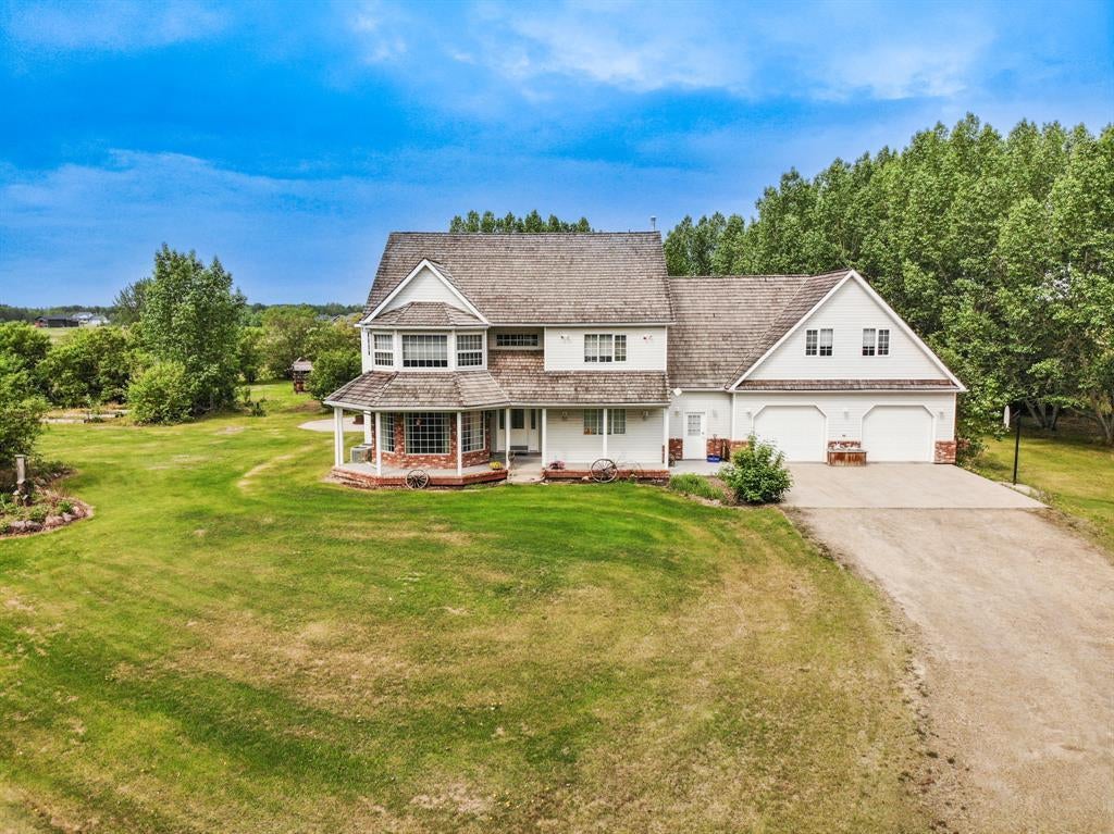 FOUND IT !!! This is a beautiful and spacious custom-built ONE OWNER home situated on a large estate spanning 16.5 acres of land ON THE EDGE OF TOWN!!! The house boasts over 4000 square feet of living space with a grand entrance way and stunning stairwell feature with 18-foot ceilings. There are 4 bedrooms and 3.5 bathrooms, including a large primary suite with a huge 5-piece ensuite that features a soaker tub. The attached garage is oversized, covering over 1000 square feet of garage space and is heated and finished with a back entry, laundry room, and boot room. There are two large living spaces, a formal dining room, and an updated kitchen with a large window overlooking the yard and access to a west-facing BBQ deck. The lowered family room off the eat-in kitchen has a fireplace feature and walks out to the deck. There is also a huge rec/entertainment room over the garage that provides ample space for gym equipment or a favorite couch, TV, and ping pong table. Upstairs, there are three large bedrooms, two bathrooms, and a large laundry/storage room. The basement is partially developed and could potentially host more bedrooms, a family room space, or storage. The yard is well-maintained with mature trees, grassy areas, and an octagon firepit area to enjoy in the summer sun. The property is conveniently located near the new Harry Belfour School being built and is only a stone's throw away from paved RR53. Overall, this is a fantastic property that offers plenty of space and amenities for a comfortable and enjoyable living experience. Anyone looking for a beautiful and spacious custom-built home on a large estate should view this property.