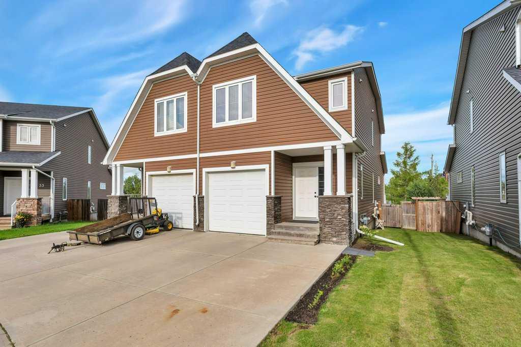Upscale duplex in popular Sunnybrook South, NO CONDO FEES! These were beautifully built by SORENTO CUSTOM HOMES, one of Red Deer's finest builders. Step inside off the covered front porch to the grand feel of this home with it's TALL CEILINGS, grand staircase lined with IRON SPINDLE railing and a view straight through to the back of the home. TILE and HARDWOOD are laid throughout the main floor and lead you into the OPEN CONCEPT kitchen/living room. The cabinets are a rich wood complimented by sleek black appliances, and the countertops provide a ton of prep space and extra seating. An abundance of windows throughout this space provide a ton of NATURAL LIGHT, and the GAS FIREPLACE gives that warm feel to the home. The stacked laundry and 2 piece bath are also located on the main floor. The upstairs offers a unique layout with TWO MASSIVE PRIMARY BEDROOMS, each with their own WALK IN CLOSETS, AND ENSUITES plus additional closet storage. Downstairs is FULLY FINISHED with another full bathroom, a large family room (that could be converted to a THIRD BEDROOM) and full WET BAR! The projector and components will stay with the home. This is a perfect basement layout to have a roommate who could have their own mini kitchen set up or keep it as a theatre room. Outside is a fully fenced yard, storage under the deck and no neighbors behind! Other updates include newer washer and dryer, AIR CONDITIONING, IN FLOOR HEATING, and custom interior lighting that offers a rainbow of colors to set and choose from. This home is VERY CLEAN, has been meticulously looked after and is located in a perfect spot, close to all the amenities South Red Deer has to offer!