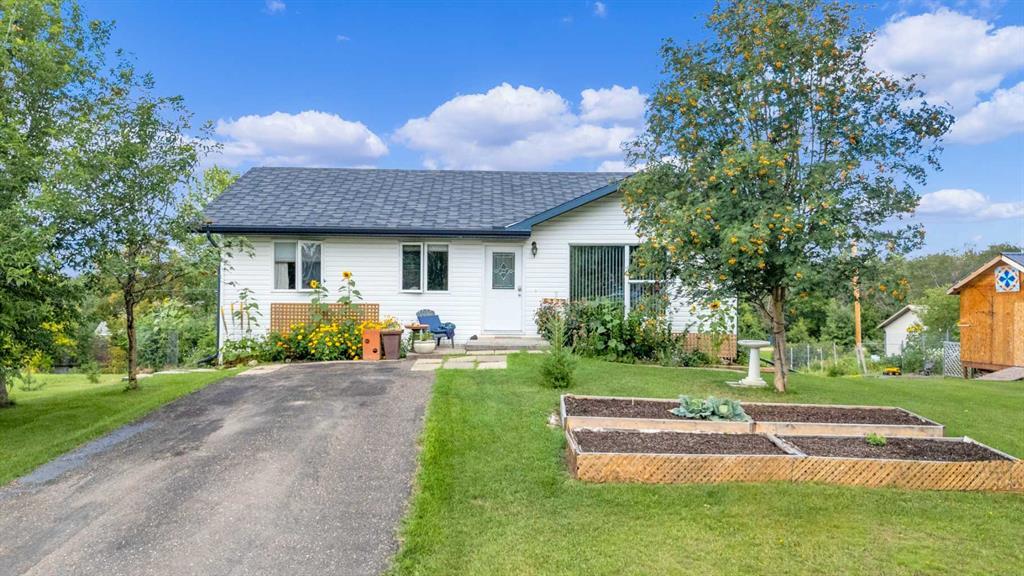 Welcome to small town living at its FINEST! This 2008 Bungalow with a walk-out basement sits in the quiet community of Mirror and comes with SIX!!! Lots! This home is clean and move in ready with 3 bedrooms on the main floor, a full bathroom plus a half bath ensuite. From the dining room area you have a patio door that lead out to a covered west facing back deck – the perfect place to start and end your days. The basement is partially finished, includes a laundry room with toilet and sink (easily add a shower if you like), room to frame in another bedroom and a large family/rec. room with a free-standing WETT inspected wood stove that has the ability to heat the whole house. There is floor heat also connected in the basement to keep the winters cozy and warm. Outside there are gardens galore for you to enjoy and plenty of room to expand if you like. There is a new 12x12 shed, tarp car port, cozy firepit area and 2 bare lots on the south side for your future garage development!! Home is clean and Move in Ready with a New hot water tank & New Eavestroughs. Loads of space, no neighbors directly behind you and amazing value in this small Alberta Community! Only 30 minutes to Lacombe or Stettler.