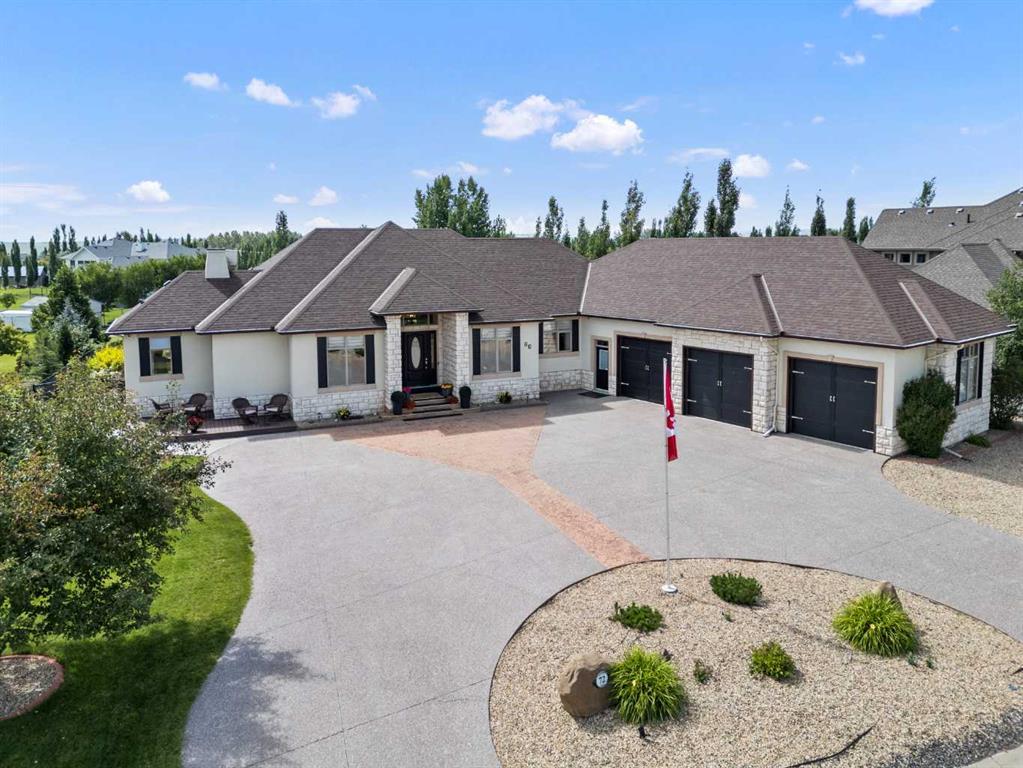 Welcome to 72 Ranch Road, a beautifully refined estate bungalow perched at the top of the Estates of Air Ranch, one of Okotoks’ most prestigious communities. With incredible views, mature trees, expansive green spaces, and 0.42 acres of land, this property offers the feel of acreage living—right in town! The massive circular driveway is the first hint that you are entering something pretty incredible. Step inside to over 2,200 sq. ft. of elegant main floor living, where a grand foyer opens into the impressive great room with den to the right and stunning stairwell to the left. The primary suite sits privately in the west wing, complete with a walk-in closet, luxurious 5-piece ensuite and private door to the recently renovated outdoor patio retreat. This rear patio has undergone a substantial renovation into a deluxe living space, complete with mechanical screens, recessed ceiling heaters, and an outdoor fireplace—a spectacular space for hosting in every season. On the east wing, the elegant kitchen boasts high-end appliances, beautiful cabinetry and a wonderful view from the window over the sink! A walk-in pantry, main floor laundry with sink, and 2-piece powder room round out east side. Rear access to the garage is sure to impress when you see the expansive space with heated floors, floor drains, and second stairwell to the lower level. This lower level is fully developed with in-floor heating and has the two separate access points. With ample space for all your needs, you will be impressed with the two oversized bedrooms with walk-in closets, a 3-piece bathroom, flex space for a home gym or storage, office area with built in cabinetry, poker/games area, pool table area, and cozy media/theatre room. The professionally landscaped yard is surrounded by nature, with open space both in front and behind, offering total privacy and peace. This home has been meticulously maintained and designed for elevated everyday living. Recent additions of mechanical solar-powered blinds on the main floor and mechanical awnings outside simply add to your enjoyment of life. If you’ve been looking for refined bungalow living, this the one!