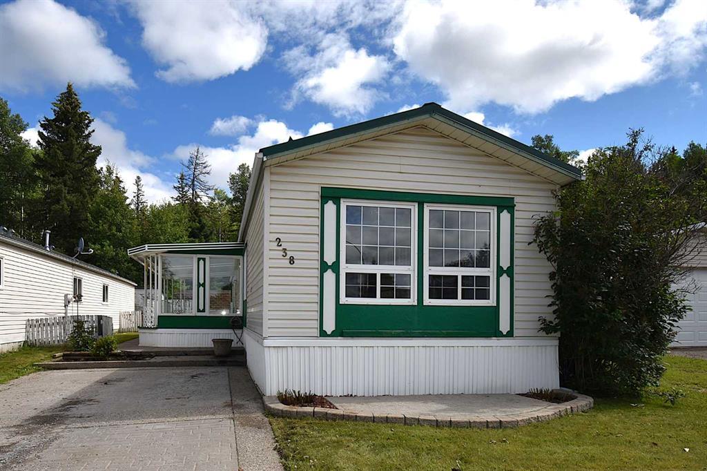 Welcome to 238 Skogg Avenue! This 3 bedroom manufactured home has much to offer. The home backs onto greenspace, has nice driveway, a 29'x10' covered deck that leads you to the front & back doors &into back yard (complete with a ramp). Step into the kitchen that features a skylight, ample cabinets and is open to the living room (no WETT Inspection for the wood fireplace). To the back of the home you will find three bedrooms, the main bath & laundry. The master bedroom ensuite features a walk-in tub (handicap accessible). Updates to the home include a metal roof, on demand hot water system, brand new BI dishwasher, the skylight has just been resealed. The home comes with a new BI dishwasher, 3 year old refrigerator, counter top stove, built in oven and 2 sheds. If you are looking to downsize, this may be perfect for you – all on one level, covered deck to soak up the sun – minimal stairs. This home is all ready for it's new owner to move right in!