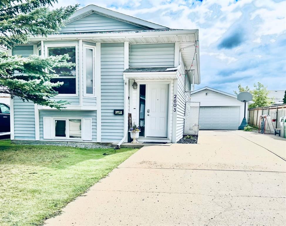 A great neighbourhood to live in! Close to schools and parks, this very well kept 3 bedroom bi-level is up for grabs! Completed up and down and a bathroom on each level. This home shows with pride from the front entry, into the bright living room, good size dining area. Two bedrooms on the main level. Family room for tv nights and a large bedroom complete the basement. There's a storage room with built in shelves as well. Looking for a home with a garage? You'll appreciate this heated oversized double garage. Fully fenced yard as well!