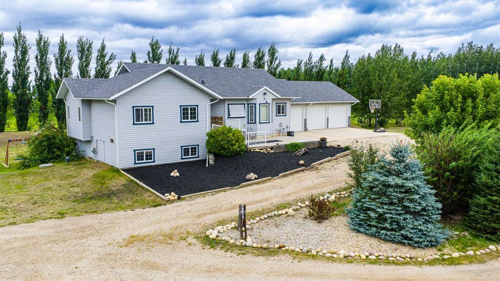 Welcome to Sunrise Estates – where the charm of acreage living meets the convenience of being just minutes from the city, all on 2.5 acres! Step inside and be greeted by a bright living room, where natural light pours through the large window by day, and the glow of the fireplace creates a cozy ambiance by night. Opposite, the spacious kitchen is a chef’s delight with crisp white cabinetry, stainless steel appliances, a pantry, and views that make even washing dishes a pleasure. A sun-filled breakfast nook with picturesque views completes this inviting main space – perfect for everyday living and entertaining. The main floor features a spacious primary suite with a walk-in closet and a relaxing ensuite, complete with dual vanity, abundant storage, a walk-in shower, and a jacuzzi tub to soak away the day. Two additional bedrooms, a full bathroom, and main floor laundry add convenience and comfort for the whole family. The fully finished walk-out basement is filled with natural light, offering a large family room for movie nights, 2 additional bedrooms, and an updated bathroom – ideal for guests or a growing family. Enjoy outdoor living on the expansive deck or take advantage of the oversized heated triple garage with plenty of space for vehicles and toys. This location is a dream for outdoor enthusiasts – the Dunes Golf & Country Club, Grande Prairie Golf & Country Club, and Wapiti Nordic Ski Club are all just minutes away, while City amenities like Costco and EastLink Centre are within a 10-minute drive. Recent updates include new paint & lighting throughout, new bsmt flooring, shingles (2020), a new VFD drive pressure tank and cistern with pump, and a septic mound with a newer pump and filtration system, making this home truly move-in ready. With 2.5 acres of peaceful landscape, spacious interiors, and unbeatable proximity to both recreation and City convenience, this property is perfect for families and outdoor lovers alike. Don’t miss your chance to own this slice of paradise!