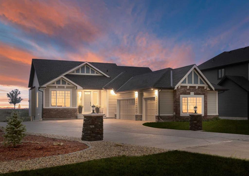 This stunning, newly built bungalow in scenic Cimarron Estates will be ready for possession before the end of the year! Situated on an 11,000 sq. ft. lot backing onto a ravine with no rear neighbours, this home offers the peace and privacy you’ve been searching for. With nearly 3,000 sq. ft. of developed living space, this fully finished home is truly move-in ready. The main level spans 1,740 sq. ft., featuring an expansive open-concept living area with vaulted ceilings in the kitchen, dining room, and great room, creating an airy, inviting atmosphere. A wall of rear windows fills the space with natural light, while beautiful hardwood flooring flows throughout. At the heart of the home, the gourmet kitchen with a walk-in pantry, full-height cabinetry, a large island with a beverage cooler, and stainless steel appliances, including a gas cooktop, range hood, wall oven, microwave, and French-door fridge. The kitchen seamlessly connects to the dining area, with access to a large deck overlooking the ravine, and the great room, featuring a floor-to-ceiling tiled fireplace, making it an ideal space for entertaining. The primary retreat features a spa-inspired ensuite with dual sinks, a full-tile walk-in shower, a soaker tub, and a large walk-in closet with direct access to the laundry room for added convenience. Completing the main floor are a mudroom off the garage, a 2-piece powder room, and a versatile den/flex room perfect for a home office or reading space. The fully finished walkout basement adds an additional 1,153 sq. ft. of living space, complete with two generously sized bedrooms, a full bathroom with dual sinks, and a massive storage/mechanical room. The lower level is complete with a bright, open rec room with an electric fireplace, a dedicated games area framed by large windows, making the lower level functional and inviting. Perfect for indoor-outdoor living, this home features a spacious rear deck off the main level and a lower patio, both overlooking the green space behind the home and the expansive yard. A side-drive triple-car garage provides ample parking and storage. With 8’ interior doors, premium finishes, and a thoughtfully designed layout, this home blends style and practicality seamlessly. Don’t miss this opportunity to own one of the last remaining newly built homes in Cimarron Estates! **Note: Photos are from a previous show home and are not an exact representation of the home for sale.