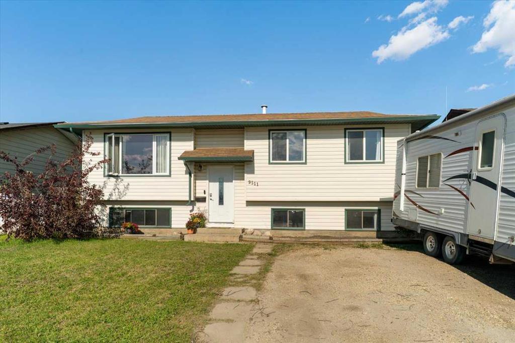 Immediate Possession and no rear neighbours! This lovely home with garage is perfect for a first-time home buyer or investor. The main floor features a functional kitchen with white cabinets, large living room and spacious dining area with access to the fully fenced and landscaped backyard. Three generous bedrooms and a full bathroom complete the main floor. Downstairs has brand new flooring and offers a large 4th bedroom, a small flex room with a window (could be a small bedroom), bright and open rec room, full bathroom and laundry room. The 21’ x 18’ detached garage is insulated, boarded and perfect to keep your vehicle protected through the winter months. The backyard is fenced, landscaped, has a nice deck with gas line for BBQ and raised garden beds. You will love the convenient location backing onto the Wembley Elementary School and steps away from the day care, skate park and rec center.