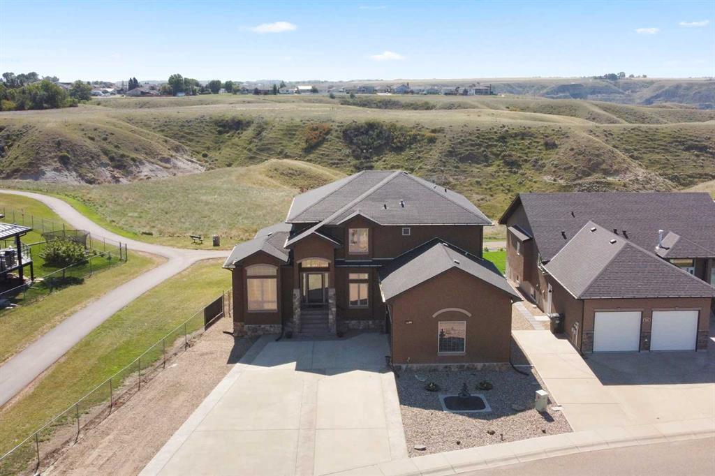 Backing directly onto the coulees with world-class views, this 2,500+ sq. ft. custom two-storey delivers a lifestyle as impressive as its setting. The main floor features soaring 19-foot ceilings that create a grand, airy atmosphere. A versatile front seating area-once a formal dining room-now offers the perfect space to read, relax, or entertain, while still easily convertible back into a dining room. The front office is expansive, offering the ideal work-from-home or study environment. The open kitchen and living room take full advantage of the incredible views, anchored by a striking 3-sided fireplace. A well-designed mud/laundry room with sink and laundry chute provides direct access to the heated double garage, complete with 220V power, mezzanine storage, and an included air compressor. Upstairs, a generous landing at the top of the staircase separates the bedrooms and adds to the sense of space. The primary suite highlights sweeping valley views, a huge walk-in closet, and a 5-piece ensuite. Two additional bedrooms and a 4-piece bath complete the upper level. The lower level offers versatility, with a wraparound space currently set up as an exercise area but easily reimagined as a rec room, games room, or additional living space. The highlight is a true home theatre, equipped with a state-of-the-art TV, surround sound system, and custom seating—all included with the home. A large bedroom and 3-piece bath round out the basement. Outdoors, a recently added front yard fountain and fresh landscaping create curb appeal, while the back deck overlooks a fully fenced yard with under-deck storage, gas BBQ line, and roughed-in electrical for a future hot tub. There is also plenty of additional space for RV parking. With direct access to the coulee trails and unobstructed views in every season, this property combines functionality, luxury, and lifestyle in one exceptional package.