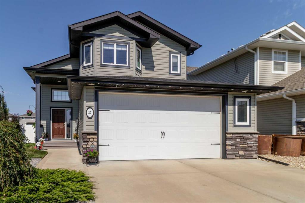 This well-cared-for home immediately stands out with its custom landscaping and decorative curbing, all backing onto a walking path. A spacious tiled entry welcomes you inside, where vaulted ceilings draw you up to the main living area. Built by Falcon Homes, this sought-after floor plan offers two bedrooms and a full four-piece bath on the main level, with the kitchen, dining, and living spaces designed for open-concept entertaining. The kitchen features dark cabinetry, stainless steel appliances, a corner pantry, and a black granite sink. From the dining area, garden doors open to a recently refinished oversized deck, perfect for overlooking the expansive yard and flower gardens. Enclosed storage beneath the deck adds practicality and keeps outdoor items organized. Above the garage, the private primary suite includes a walk-in closet and three-piece ensuite. The fully finished basement provides additional living space with a large family room, extra bedrooms, and another full bath. One particularly spacious room with French doors is currently set up as storage but could easily transition into a fifth bedroom with the addition of flooring . There’s also convenient storage tucked under the stairs. Notable upgrades include air conditioning (installed in 2023), roughed-in in-floor heating, a newer hot water tank, and custom blinds throughout the upper levels. This property is ideally located just a short walk from Iron Ridge Intermediate and St. Gregory the Great schools, making it an excellent choice for families.