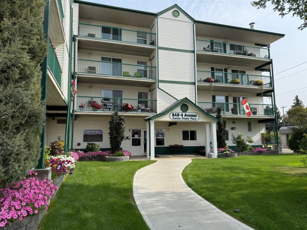 This spacious condo in Centre Point Place, an adult-living only building, is the perfect fit for those looking to slow down and enjoy a more relaxed lifestyle. Being one of the larger units in the building, it was thoughtfully designed to be wheelchair accessible with wider-than-average hallways and doorways. Inside, you’re welcomed by a generous entryway that leads to the primary suite, complete with a large bedroom, walk-in closet, and ensuite featuring a walk-in shower with glass doors. A second bedroom and an additional 4-piece bathroom provide extra space for guests or hobbies. The kitchen offers a functional wraparound countertop with ample cupboard storage, and the counters were updated just a few years ago. The spacious living room has been refreshed with new vinyl flooring and is filled with natural light from the many south-facing windows and patio doors that open onto a wraparound balcony. The balcony spans two sides of the unit, includes two exterior storage spaces, and is equipped with a gas line hook-up—perfect for outdoor living. Additional highlights include a large in-unit storage/laundry room, complete interior repainting (walls, trim, doors, and ceilings), and the convenience of modern updates throughout. Centre Point Place itself offers fantastic amenities such as underground heated parking (1 stall included), a gym, recreation room, and a welcoming common area with mailboxes and landscaped garden space at the front. Don’t miss out on this rare opportunity—book your showing today!
