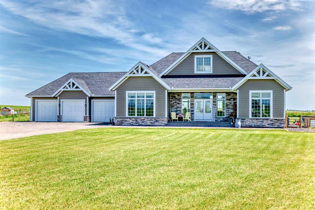 Excellent location- only 3.5km out of central Okotoks via Big Rock Trail! Tiki Ranch may be considered part of Okotoks but it is definitely acreage living (3 acres and plenty of room for a workshop)! This 5 bedroom bungalow is perfect for all stages of life. From the time in your life where you need multiple bedrooms to the time when you need a craft room, den, wrapping room and guest room, this home will fit you! The main floor is open concept with 20’ vaulted ceilings, hardwood and floor to ceiling windows. The living room has an impressive fireplace with room for TV above. The dining room leads out onto the east facing deck where you can enjoy your morning coffee in peace. Feel like growing your own vegetables, there' are two raised beds at the side of the house. The kitchen features full height white cabinetry, granite counters, Bosch stainless steel appliances including a gas stove and double oven. A convenient corner pantry with spice rack behind the door completes the kitchen. The primary suite is absolutely massive with an incredible mountain view. The spa-like ensuite has heated floors, soaker tub, tiled shower and double sinks. Walkin closet has built-in shelving. Two additional bedrooms on the main floor, (each has its own sink) and are connected via a Jack & Jill bathroom with toilet and bath/shower. Laundry/mud room leads to the triple garage with a large dog pen that leads to the dog run. No worrying about your dogs being left in the house all day! The developed basement has 9’ ceilings, family room, exercise room, two more bedrooms and 3 piece bathroom. Plenty of extra developable space in the basement as the utility room is huge and there’s loads of space for storage. Other features include AC, starlink and radon mitigation.